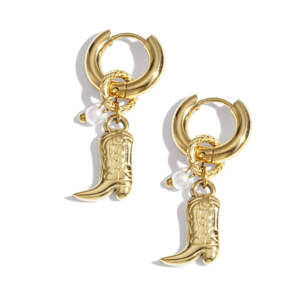 Unieke oorhangers uit de Eenvoudige serie, vervaardigd uit hoogwaardig roestvrij staal en uitgevoerd met een gedetailleerde 'cowboy boot' hanger en een verfijnde parel. Dankzij het gebruik van duurzaam edelstaal zijn deze oorbellen volledig waterproof en behouden ze hun glans en kleur, zelfs bij dagelijks gebruik.